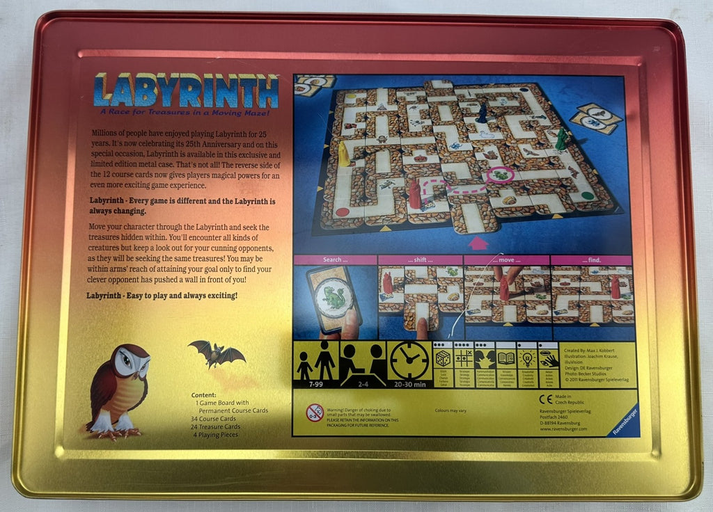 Part of the Ravensburger Labyrinth Games series, This is a super-simplified version of Labyrinth for the really younger set. Instead of the shifting tiles of the other versions, in this game, entire sections of the maze shift, as the modular 3-D board has a sliding center piece, which allows for different pathways through the maze. Players attempt to reach the items shown on their treasure cards by shifting the maze and moving through the corridors.
