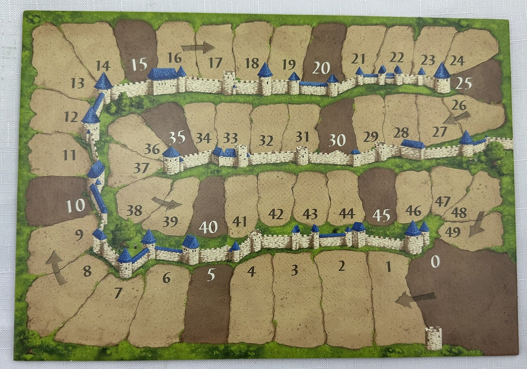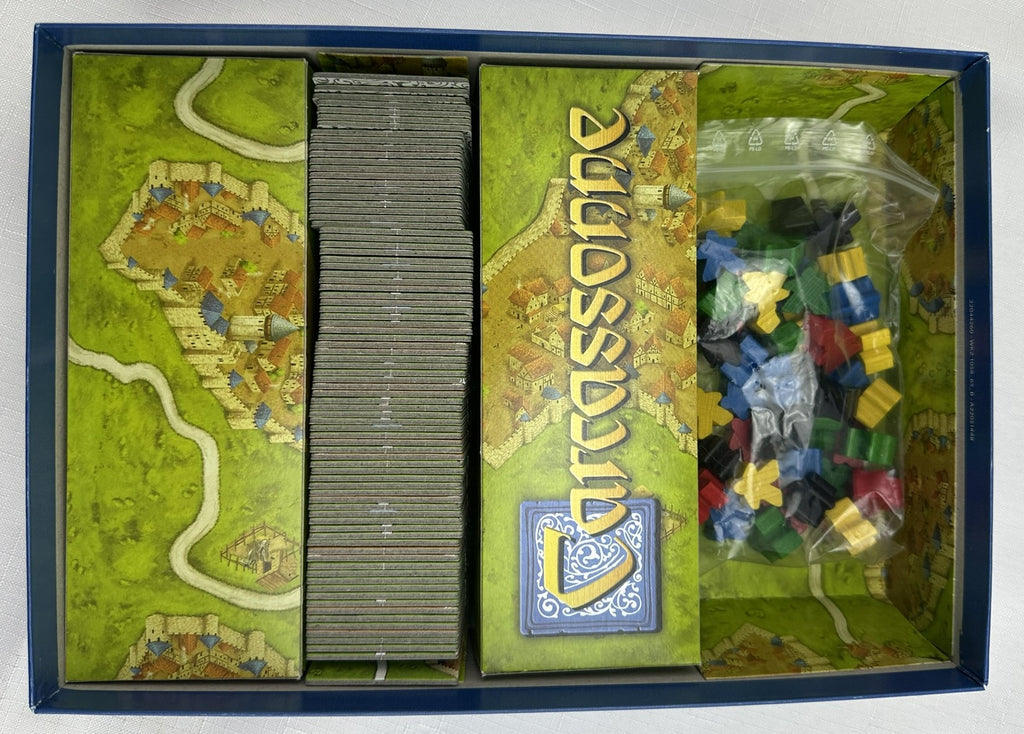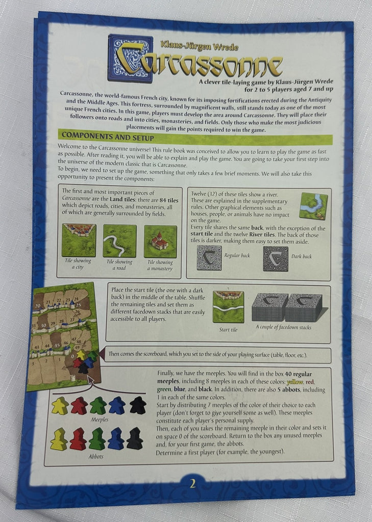 Carcassonne is a tile placement game in which the players draw and place a tile with a piece of southern French landscape represented on it. The tile might feature a city, a road, a cloister, grassland or some combination thereof, and it must be placed adjacent to tiles that have already been played, in such a way that cities are connected to cities, roads to roads, et cetera. Having placed a tile, the player can then decide to place one of their meeples in one of the areas on it: in the city as a knight, on the road as a robber, in the cloister as a monk, or in the field as a farmer. When that area is complete that meeple scores points for its owner.