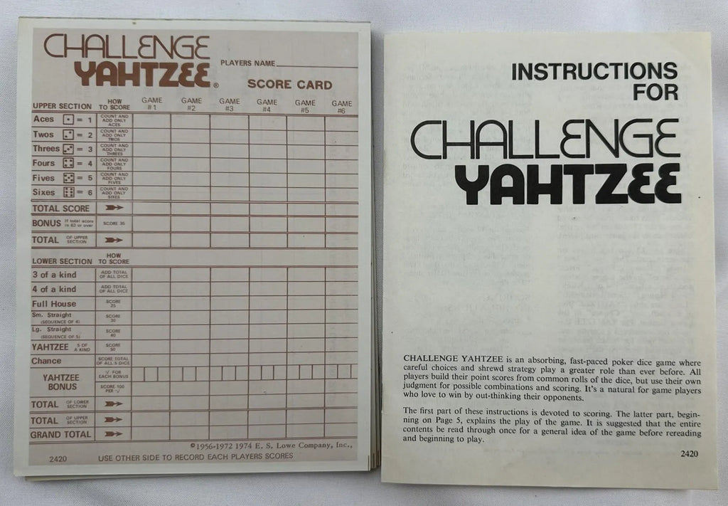 Challenge Yahtzee Game - 1974 - Milton Bradley - Great Condition