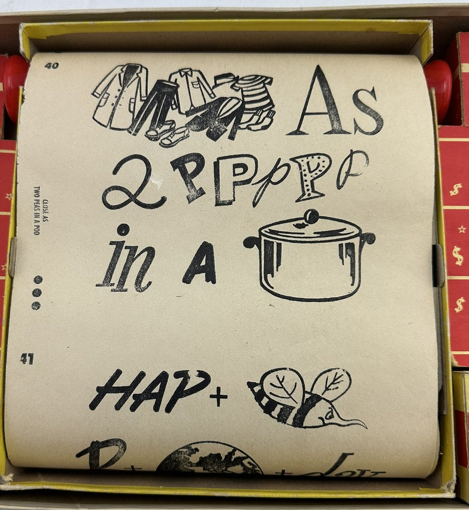A rebus puzzle is covered by matching pairs of items. The items are covered by numbered slides. The slides are numbered one through thirty in the Milton Bradley editions and one through twenty-five in all other editions. each player or team chooses two numbered slides and reveal whatever items are beneath the slides. If the items match, then the items are removed to reveal parts of the rebus puzzle of which the team may hazard a guess. Solve the rebus puzzle and receive the value of all matching pairs possessed in play money. The side that has more money after three rebuses wins.