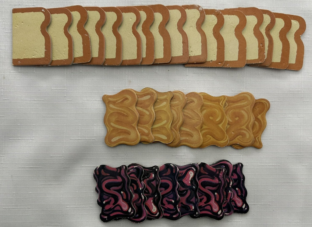 Roll the die and collect various parts of a peanut butter and jelly sandwich.