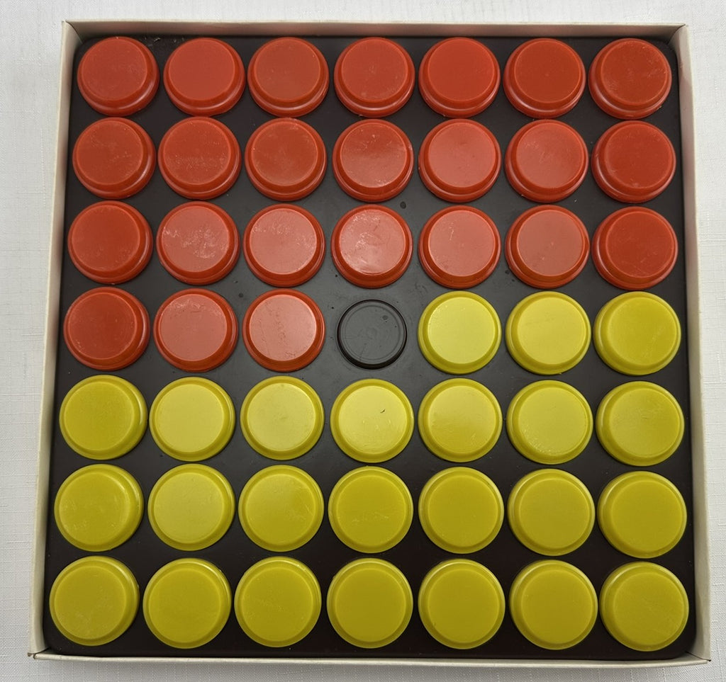 A checkers-like game featured in the Quick Winner Family Fun Games line by Hasbro in the 1970s. The game features 48 checkers in orange and yellow. Players take turns filling in the board except for the center circle to set up. An extra checker is used to stack on one of your players to make an "officer". The ultimate goal of the game is to eliminate all of your opponents officers, or force them to be unable to take a move. Single checkers, or "guards" move one space and can either jump checkers to remove them, or move onto a friendly piece to form a new officer. Officers can move any number of spaces in a single direction, but can only remove other officers.