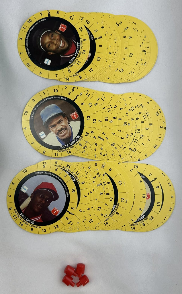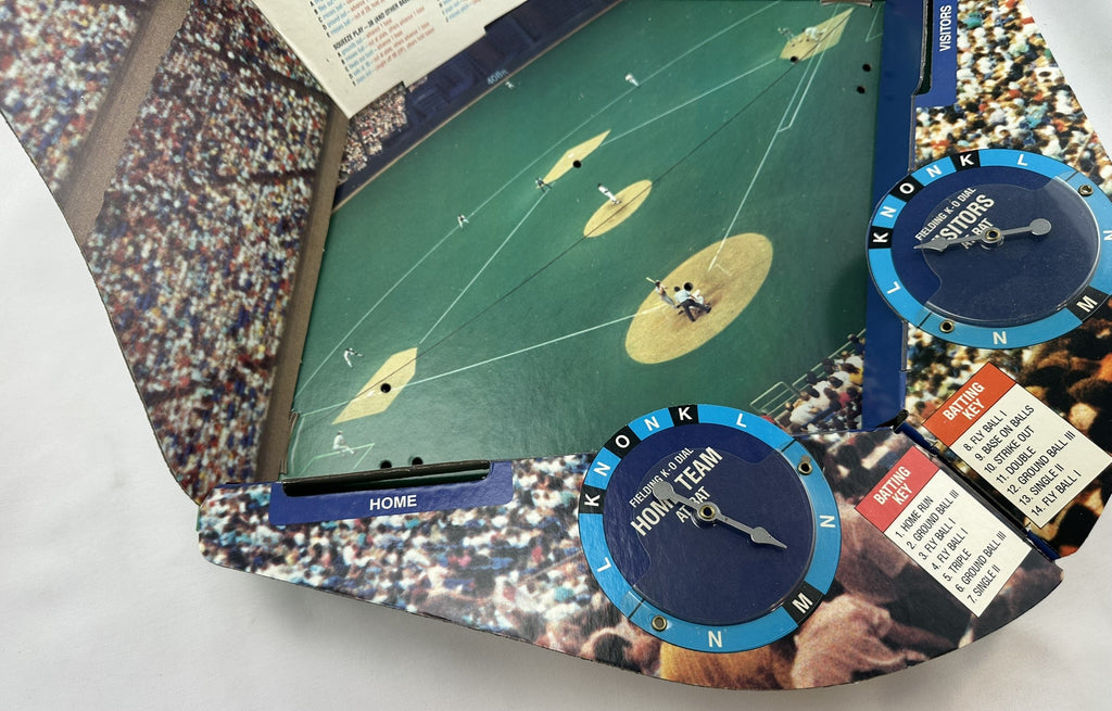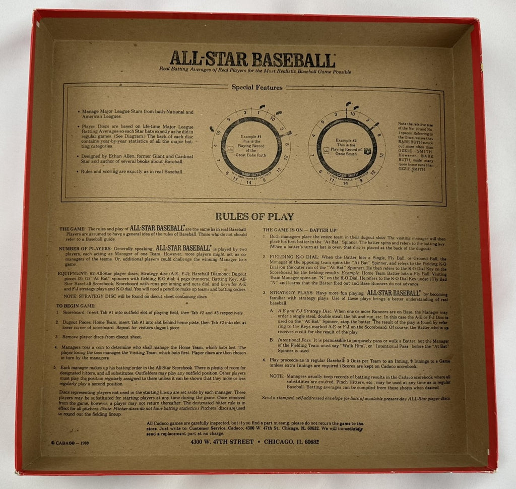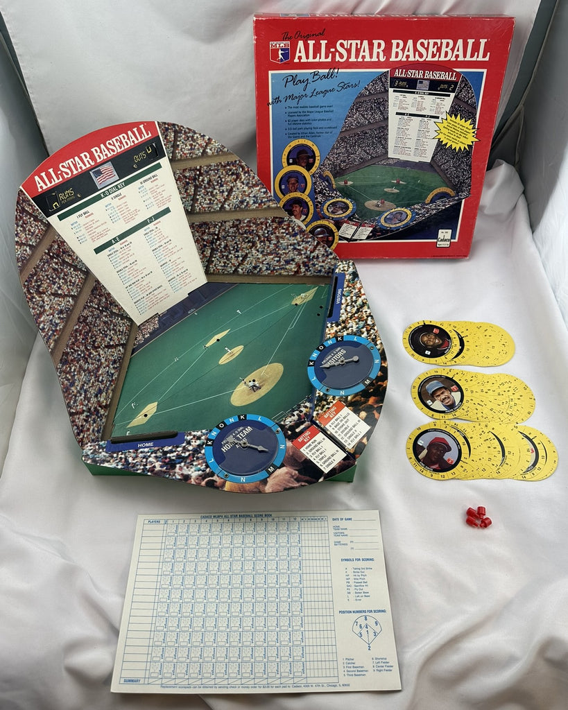 Designed by former major league player Ethan Allen and introduced in 1941, All-Star Baseball became one of the most popular sports games of all time. The game is essentially a batting simulation of major league baseball, built around a spinner and player disks that are divided into sections in such a manner that a hitter has the probabilty of reproducing his real-life statistics in such important categories as home runs, triples, doubles, singles, walks, and strikeouts. In general, the game follows the basic rules of major league baseball. Teams are created from the player disks supplied with the game (often a mix of current players and all-time greats such as Babe Ruth) and from player disks for other seasons published separately. The team at bats places the appropriate player disk on the spinner, spins, and reads off the resulting number. The game does not attempt to realistically simulate pitching and defense. Thus a hitter's result from a time at bat is not affected by the opposing pitcher or the defensive prowess of the fielder to whom the ball may be hit, although the player in the field on some play outcomes is required to spin a second spinner to determine the advancement of base runners and other certain details. Results of each play are recorded on the field using plastic pegs for the base runners, while runs and outs are tallied on a rotating scoreboard. Cumulative runs scored are tallied on paper score sheets. Strategy discs are included that enable plays like sacrifice flies, stealing bases, bunting, hit and run, etc. The team with the most runs after nine innings (or extra innings, if needed) is the winner.
