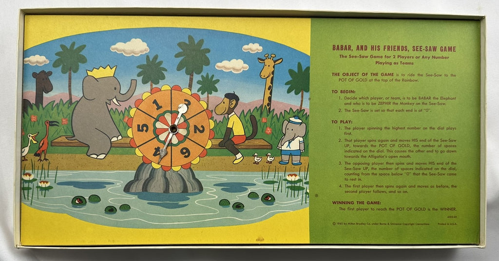 Each player chooses to be Babar the Elephant or Zephir the Monkey. Set the See-Saw to 0 for both players. The first player uses the spinner and moves the See-Saw up towards his Pop of Gold as many spaces as the spinner indicates. This will cause the other player's character to go down towards the alligator's mouth. Now the other player spins, and moves the See-Saw up, causing the first players character to go down. Play continues like this until one player reaches the Pot of Gold.