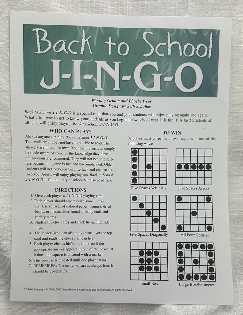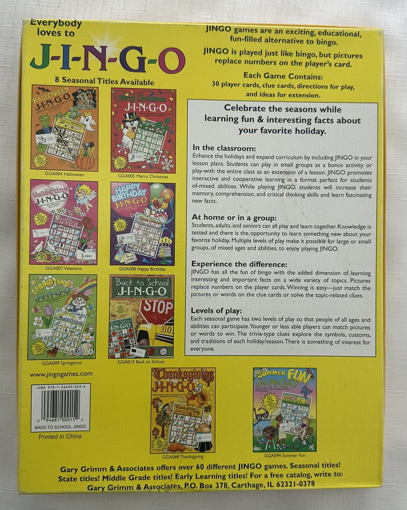 Back to School Jingo Bingo Game - Gary Grimm - 2006 - Great Condition