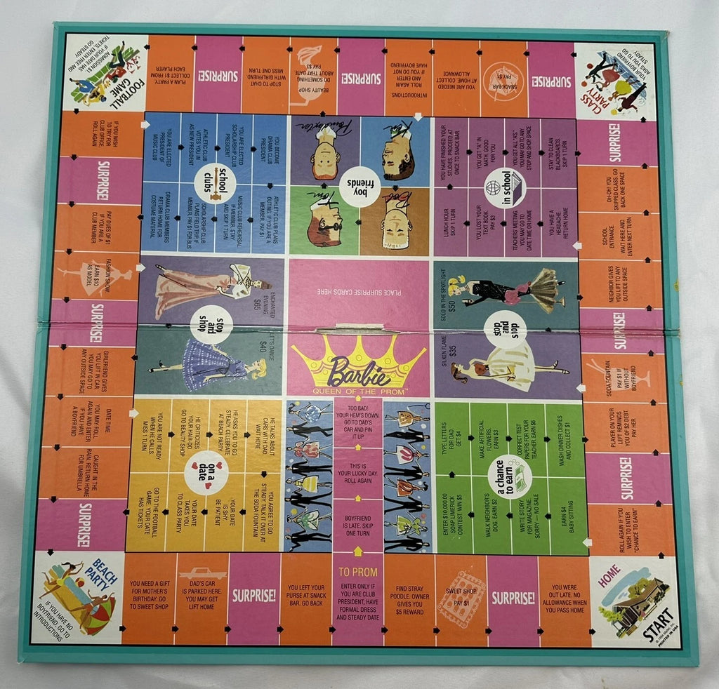 In this game you are Barbie. You win if you are the first player to be crowned Queen of the Prom. But in order to win you must have a steady boyfriend, a prom dress and be elected president of a school club. Midge, your best friend, and your little sister, Skipper, and Ken share the fun.