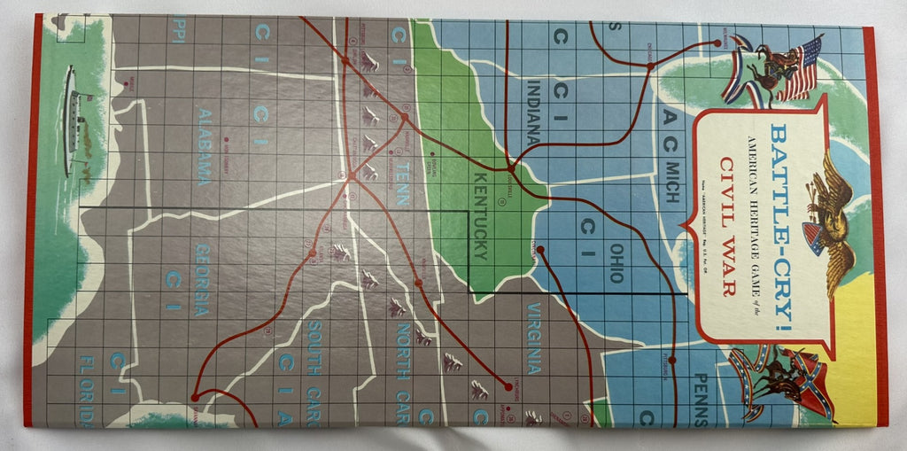 This one is the American Civil War game. Each side has 22 pieces (10 infantry, 10 cavalry and 2 artillery), and the starting positions are fixed. The grid is square, with no diagonal movement allowed. On your turn, you roll two dice for movement, resulting in between 2 and 12 movement points to allocate. Infantry moves 1 per pip, cavalry and artillery 2 per pip (a one-square move still consumes 1 pip). Mountains force pieces to pause (they must stop until the next turn). Railroads link stations and can be used to accelerate movement (one station per pip).