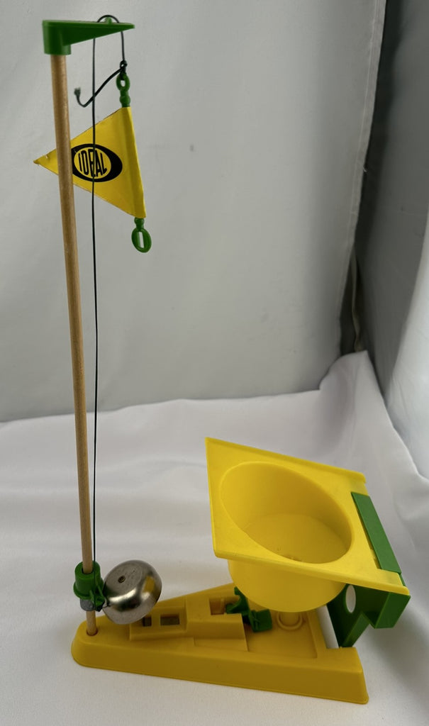 Steel balls go down the ramp or "Bingleflinger," bounce on one or more of the "Hum Drums," go through the "Flickerticker," bounce on more "Hum Drums" through/around the "Banglevator" and eventually into the "Boinglebucket" to raise the IDEAL flag. If unsuccessful, then the next player gets to move a piece and make an attempt at raising the flag. Play continues likewise until someone devises a successful system of components and raises the flag. The directions actually have several games you can play against other players and score.