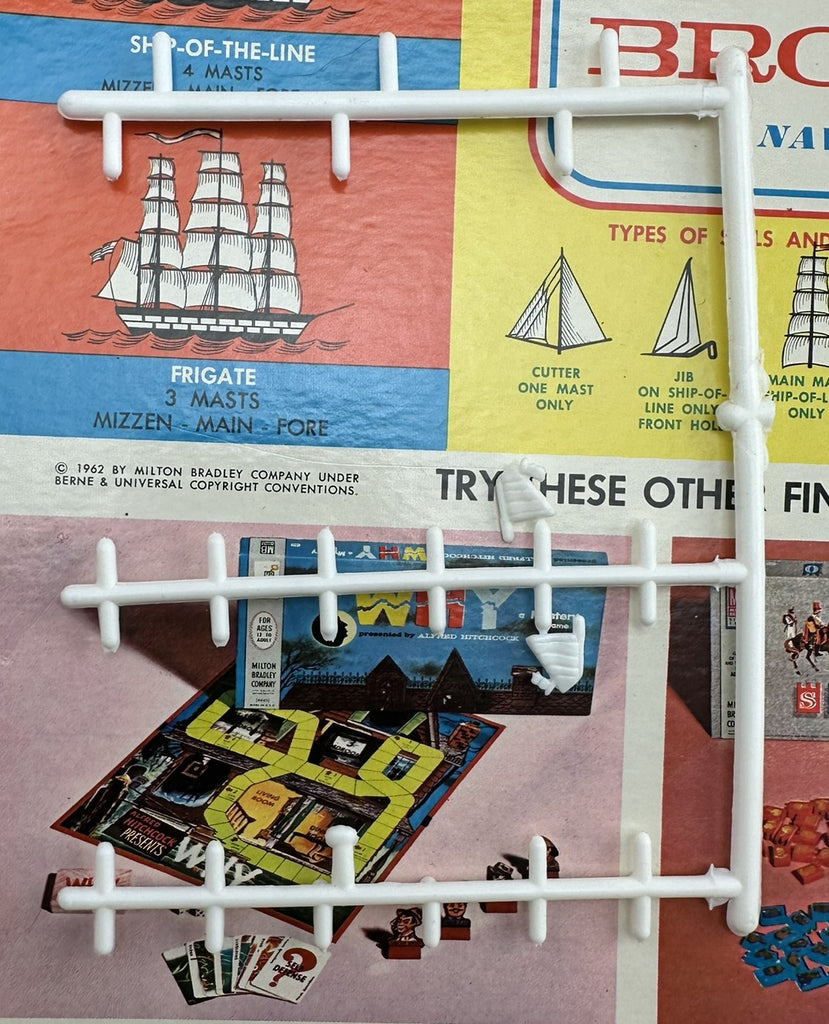 Broadside is an American Heritage game from the "Command Decision" series published by Milton Bradley circa 1962. Players take turns maneuvering their frigates and other ships to gain position so as to fire their cannons and destroy the masts on the enemy ships. Not for hardcore gamers, Broadside is an introductory wargame of early naval combat on the high seas. Some ports are guarded by land based cannons and players risk losing ships by straying too close. Rules are easy to learn and like "Dogfight" the game includes some great plastic miniatures to play with.