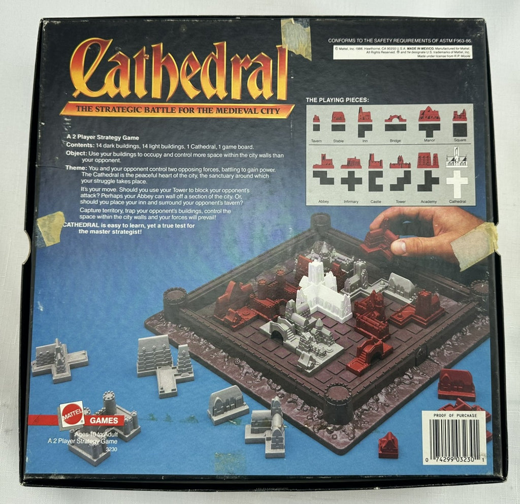 In Cathedral, each player has a set of pieces of a different color. The pieces are in the shapes of buildings, covering from one to five square units. The first player takes the single neutral Cathedral piece and places it onto the board. Players then alternate placing one of their buildings onto the board until neither player can place another building. Players capture territory by surrounding areas that are occupied by at most one opponent or neutral building. A captured piece is removed and captured territory becomes off-limits to the opponent. The player with the fewest 'square units' of buildings that can't be placed wins.