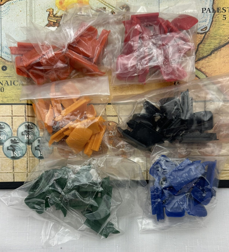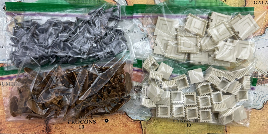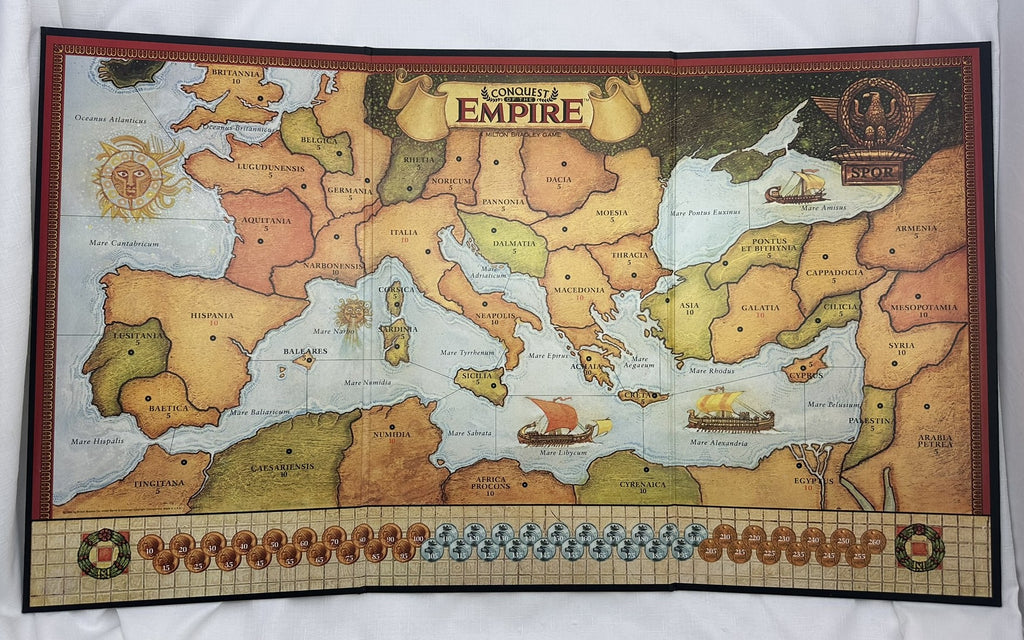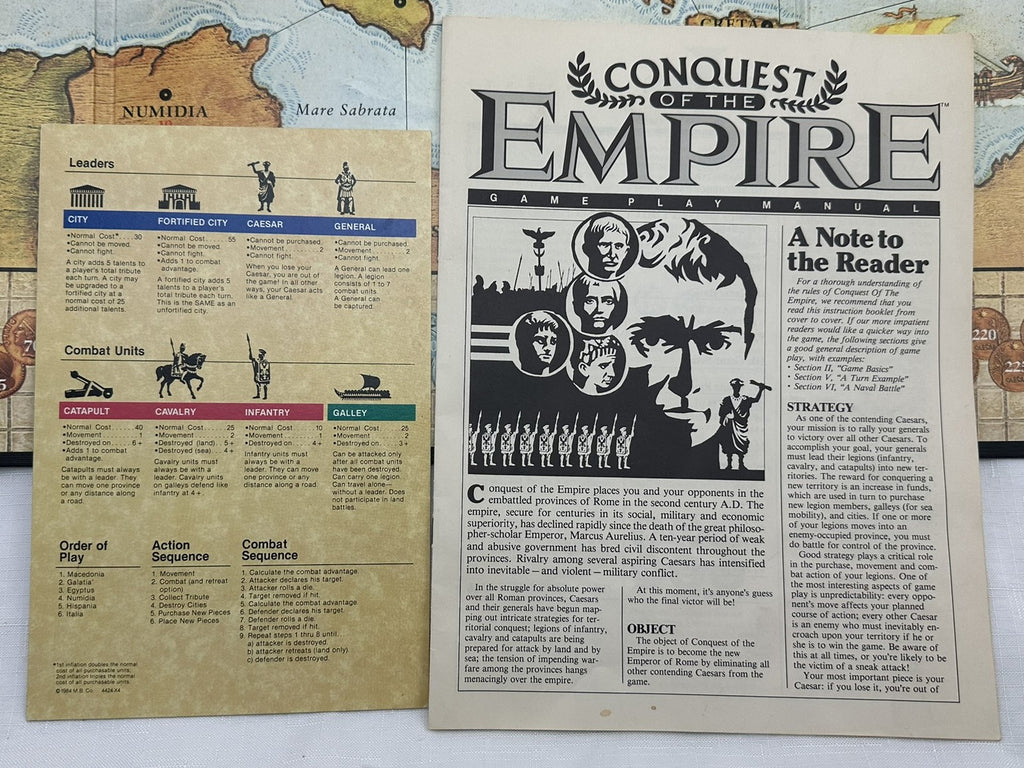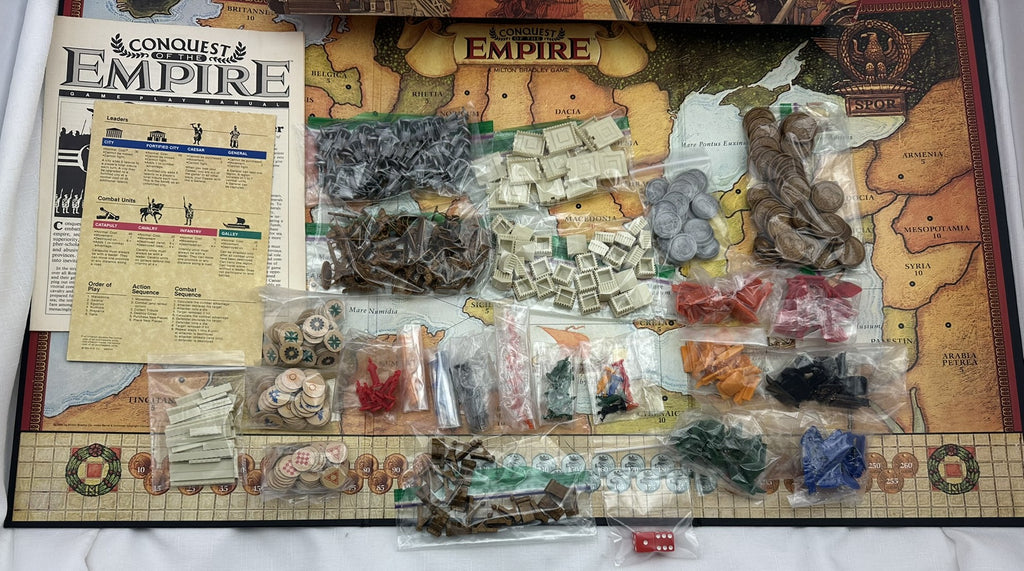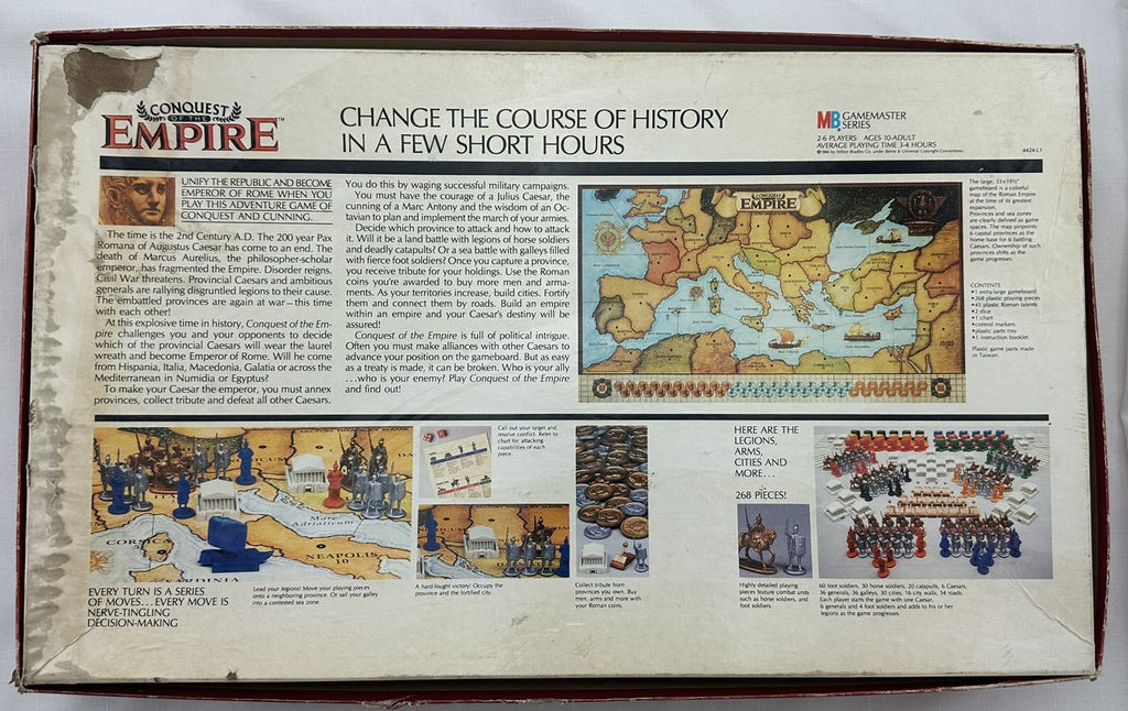 Conquest of the Empire is part of Milton Bradley's Gamemaster series. It is set during the Roman Empire and depicts the struggle around the Mediterranean as rival factions attempt to take control of the empire. Each player plays one of these factions and receives a Caesar figure, several general figures, and ships of a specific color. Along with these leaders, players utilize a pool of generic units composed of infantry, cavalry, and catapults. All game pieces are plastic figures.