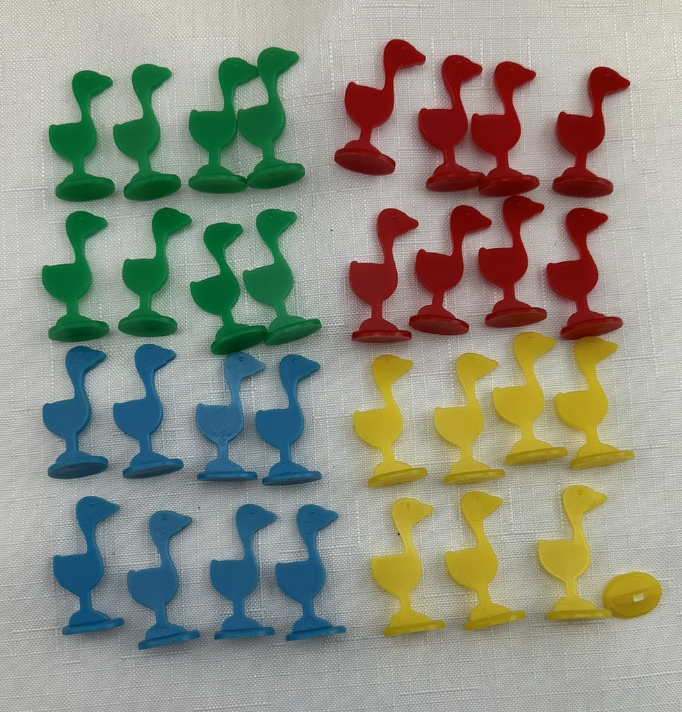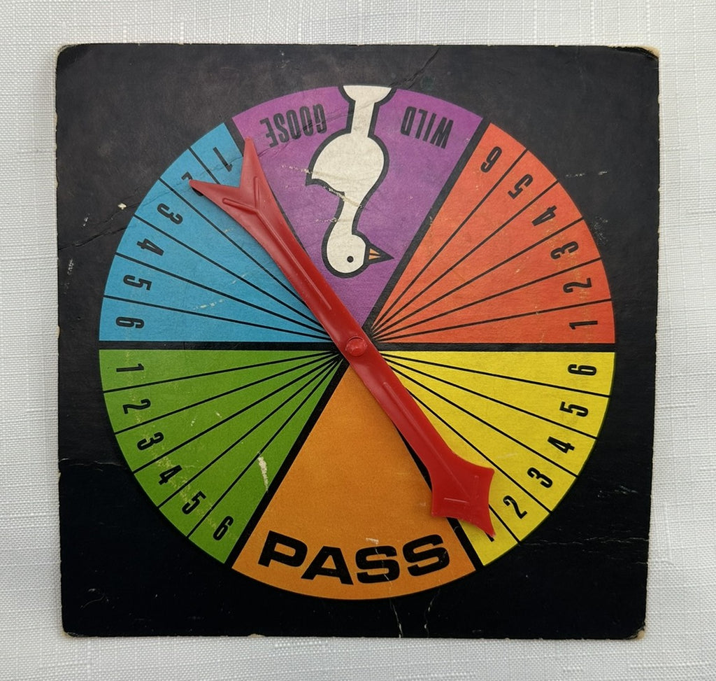 A children's game in which players spin the spinner to determine which section of the pivoting game board they must place their plastic goose piece on. Players continue adding pieces until one side of the board weighs sufficiently more than the other and tips over, spilling the geese into the pot below.
