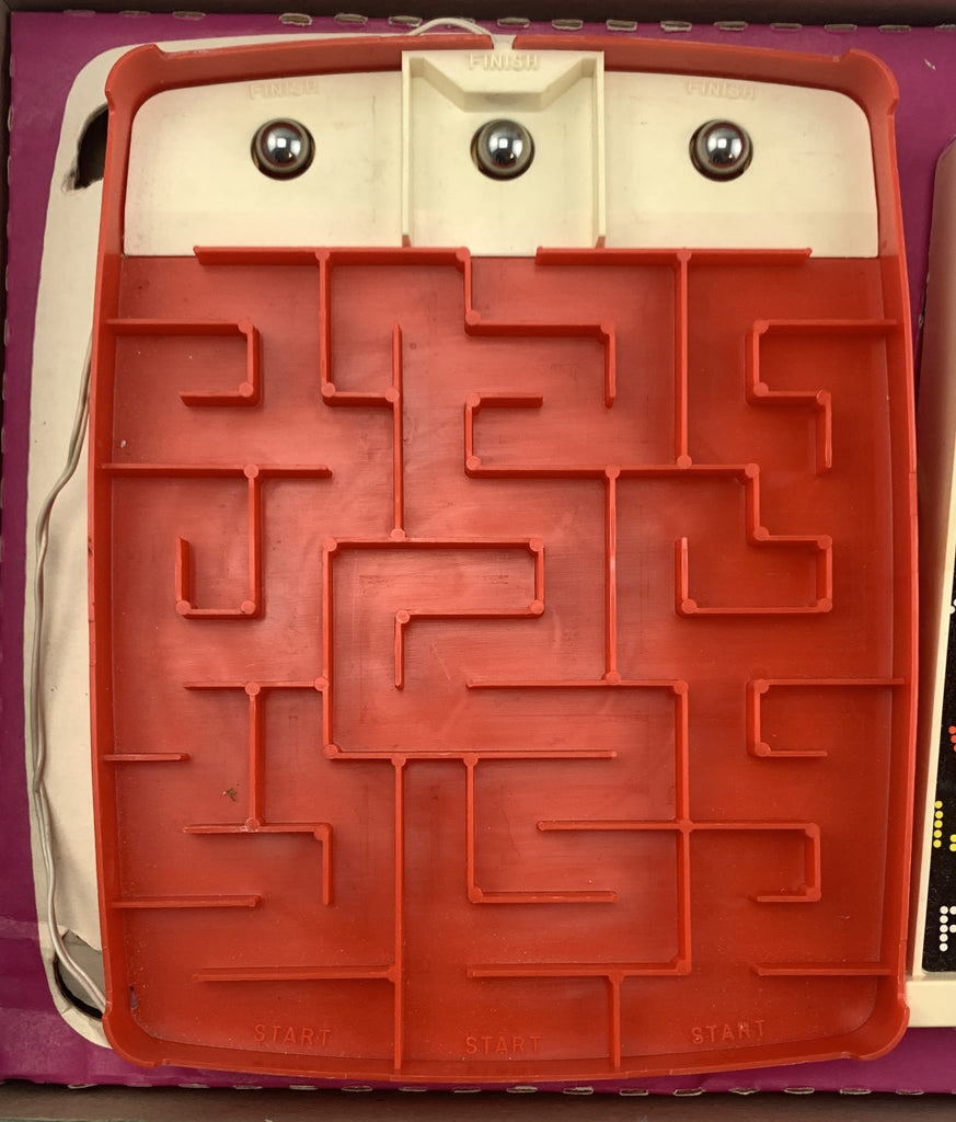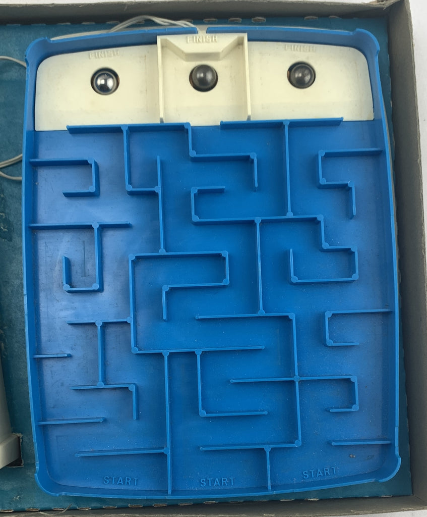 Two large plastic reversible gameboards are used. The boards have a linear maze molded on one side and a circular maze on the other. The boards have "finish" holes at the top that each contain a metal contact. A wire leads from the board to a column that has lights in each players colour.