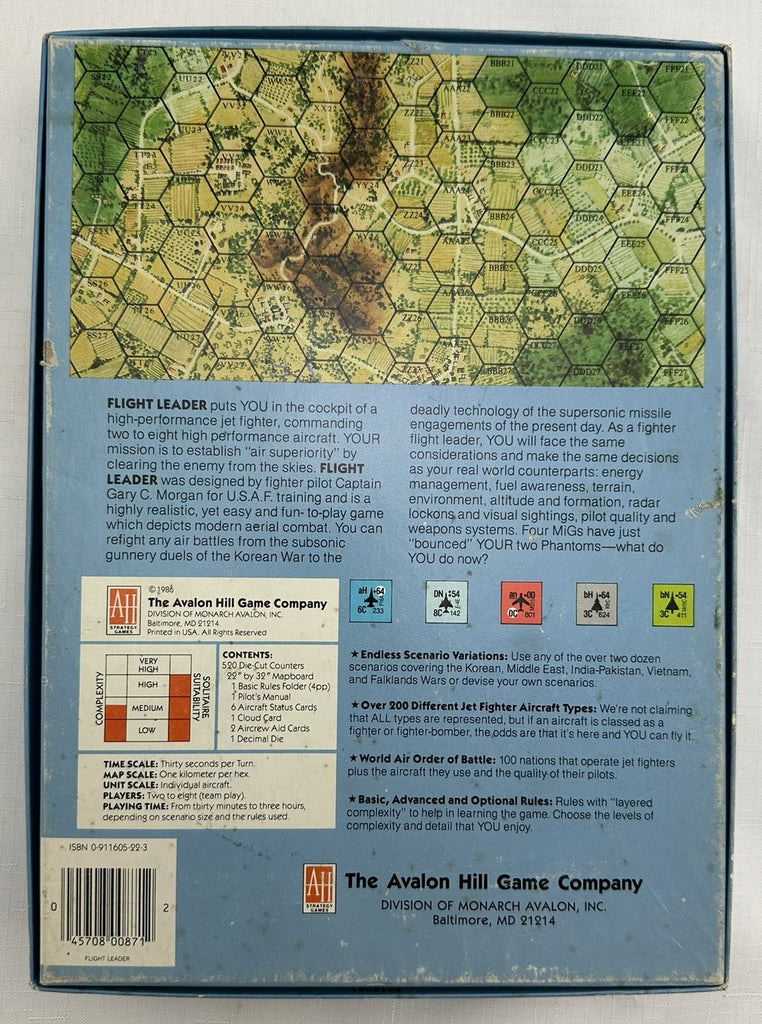 FLIGHT LEADER puts YOU in the cockpit or a high-performance jet fighter, commanding two to eight high performance aircraft, YOUR mission is to establish "air superiority" by clearing the enemy from the skies. FLIGHT LEADER was designed by fighter pilot Captain Gary C. Morgan for U.S.A.F. training and is a highly realistic, yet easy and fun-to-play game which depicts modern aerial combat. You can refight any air battles from the subsonic gunnery duels of the Korean War to the deadly technology of the supersonic missile engagements of the present day. As a fighter flight leader, YOU will face the same considerations and make the same decisions as your real world counterparts: energy management. fuel awareness, terrain, environment, altitude and formation, radar lockons and visual sightings. pilot quality and weapons systems. Four MiGs have Just "bounced" YOUR two Phantoms-what do YOU do now?