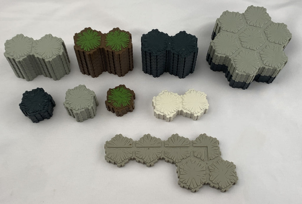 Players can build many different battlefields by attaching and stacking terrain tiles of different sizes. The battlefield/scenario section includes 8 scenarios and 2 terrain layouts. Games can be opponent elimination, getting to a certain space, protecting a certain figure, or holding out for a certain number of turns.