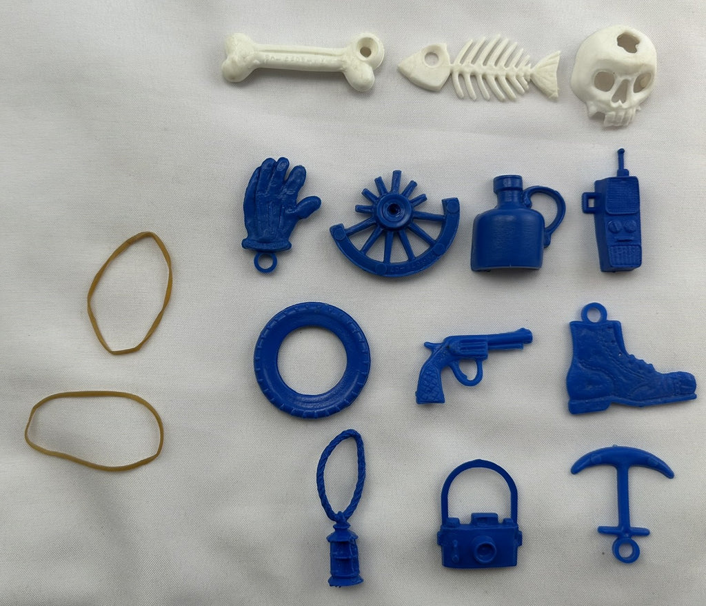 1975 Ideal Jaws Game junk pieces. Here are the game pieces that go into the sharks mouth- Blue Pieces (Shoe - Gun - Wagon Wheel - Jug - Camera - Car Tire - Hand - Walkie Talkie - Anchor - Lantern) White Pieces (Human Bone - Skull - Fish Bone) There should be 13 pieces in the game. The game also included 1 Hook