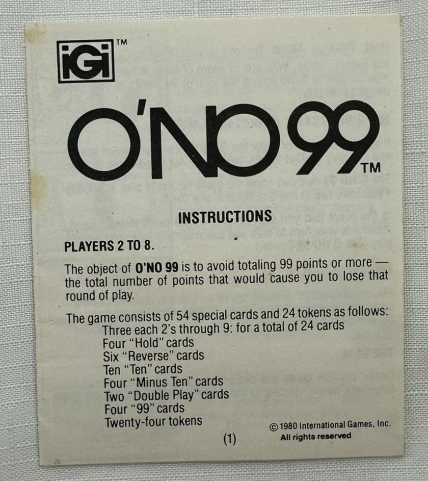 Another in the line of Uno styled and themed games. The object of O'NO 99 is to avoid totaling 99 points or more, which would cause you to lose that round of play. If a player loses four rounds, they are out of the game.