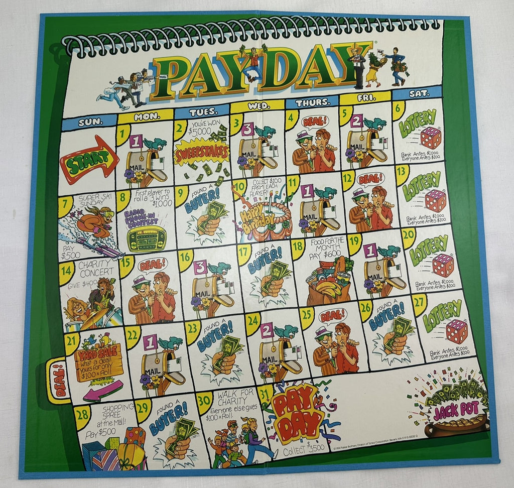 Pay Day is played on a one-month calendar with 31 days. During the game, players will have to deal with various bills and expenses, but will also have the opportunity to make deals on property and earn money. At the end of each month, players are paid their salary (the same for each player) and must then pay off all outstanding bills, taking out a loan if necessary. Most money (or least debt) wins after a certain number of months decided by the players (3 months usually takes 30 minutes to finish).