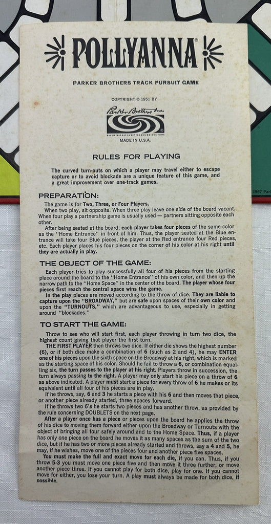 The game is widely recognized as a variant of Parcheesi, which is itself derived from Pachisi, a classic game of India. The object of Pollyanna, as in all games of the Pachisi family, is to be the first player to move his or her four men from the start space around the board to the home space. During the course of the game, players may also land on single opposing pieces and send them back to start. Two or three opposing pieces on the same space can neither be captured nor passed.
