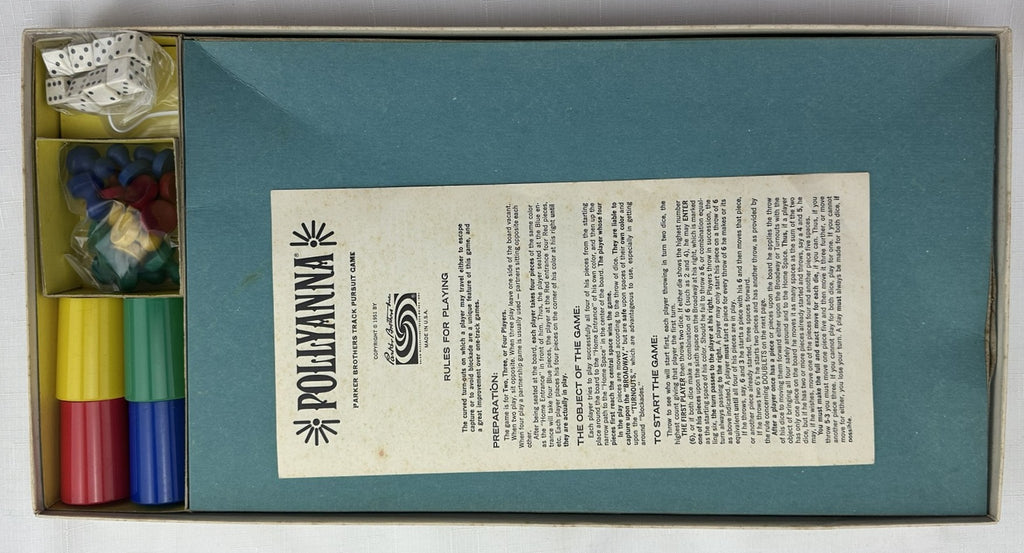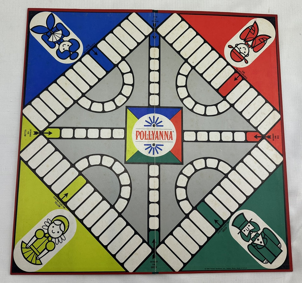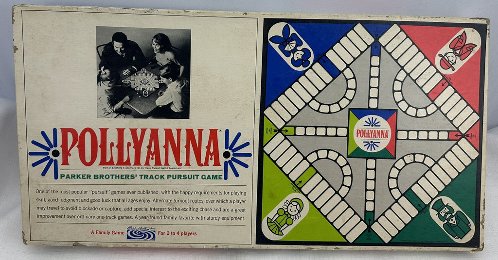 Pollyanna is a race/pursuit game published by Parker Brothers between 1915 and 1967. During those years, several editions appeared with differing artwork and game pieces. Some of these editions are entitled Dixie or Dixie-Pollyanna and some are subtitled "The Great Home Game," "The Glad Game," or "Parker Brothers Track Pursuit Game." Pollyanna itself gets its name from the title of the 1913 children's novel by Eleanor H. Porter. Each piece color in the game is associated with one of the characters in the novel. In the original 1915 edition blue was Aunt Polly; green was Nancy; red was Jimmy; and yellow was John Pendleton. These color associations changed in future editions.