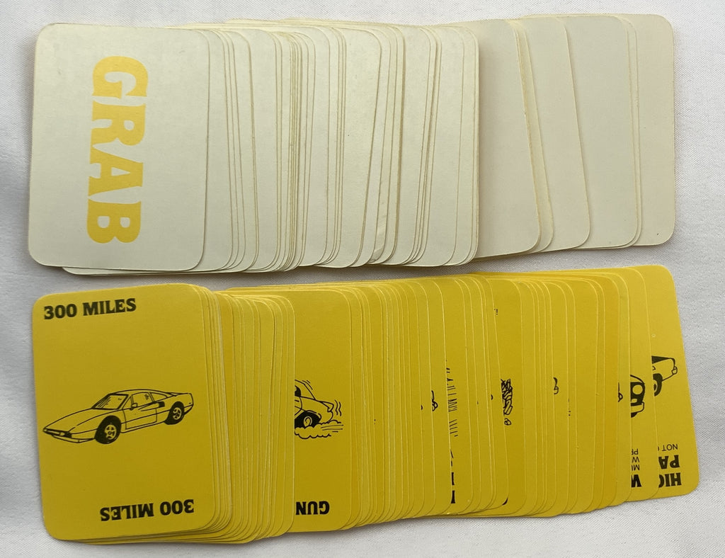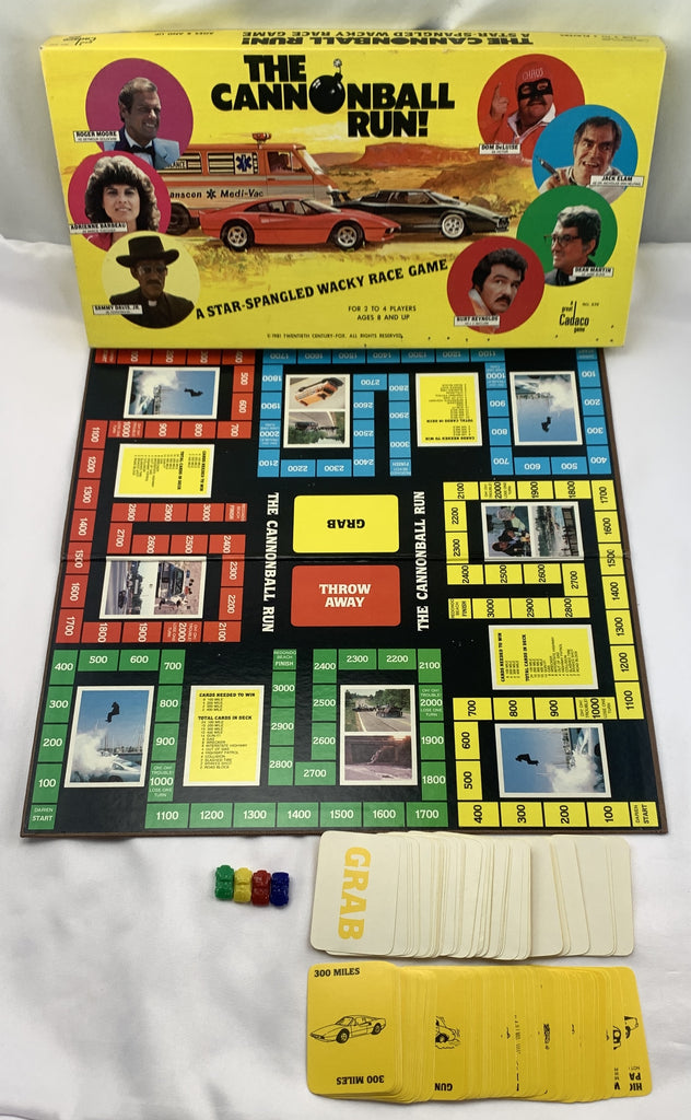 This game is based on the movie of the same name from 1981. It uses many of the mechanics found in the game "Mille Bournes". Cards are selected and played for stopping and going, and other cards represent mile markers and hazards along the way. You can play hazards on others and attempt to prevent them from happening to you. The cover features many of the principal actors and actresses in the movie (except Jackie Chan-- I guess his fame wasn't realized yet according to Fox).