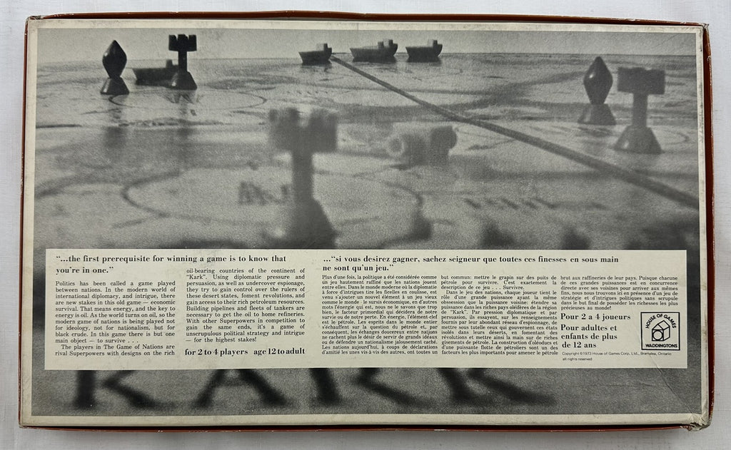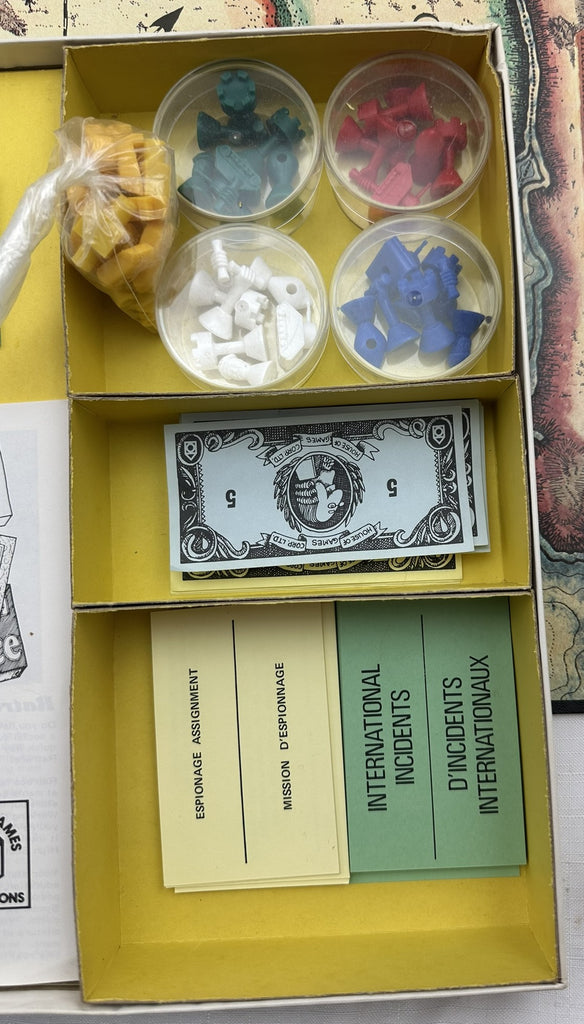 You start with a leader of your color on the capital of a country and one tanker that can transport oil from that country's port to your country. To reflect a level of organisation, oil is worth more per shipping if a king or politician is in place than a dictator or guerrilla, whose job is more offensive. You spend money to move leader pieces about the board, with the managing pieces costing more than the offensive pieces. Secret agents also move each turn and are used to defend attacks by blocking the path of opposing leaders and for moving onto "?" spaces to take a gamble on an incident card. At face value, half the cards are favourable and half not, but all offer diplomatic opportunities for the country who is most stable.