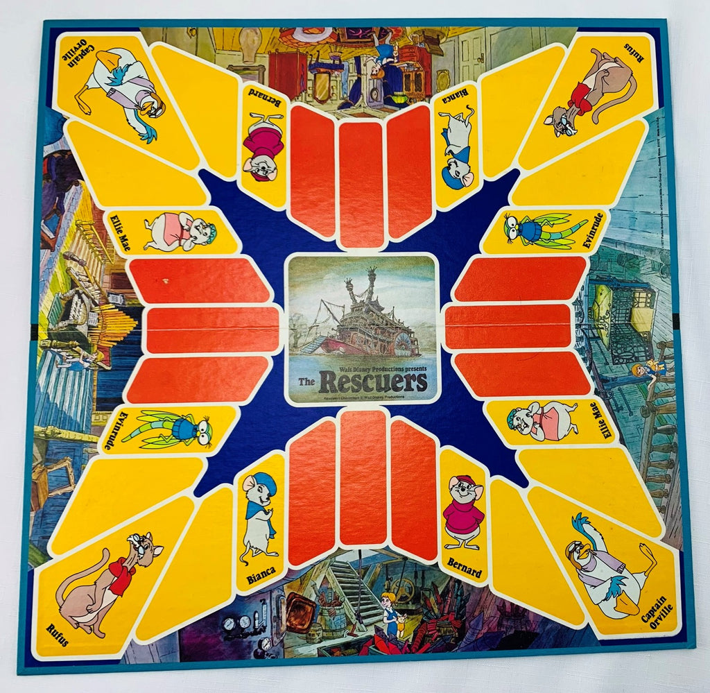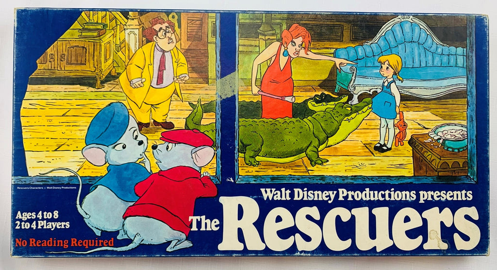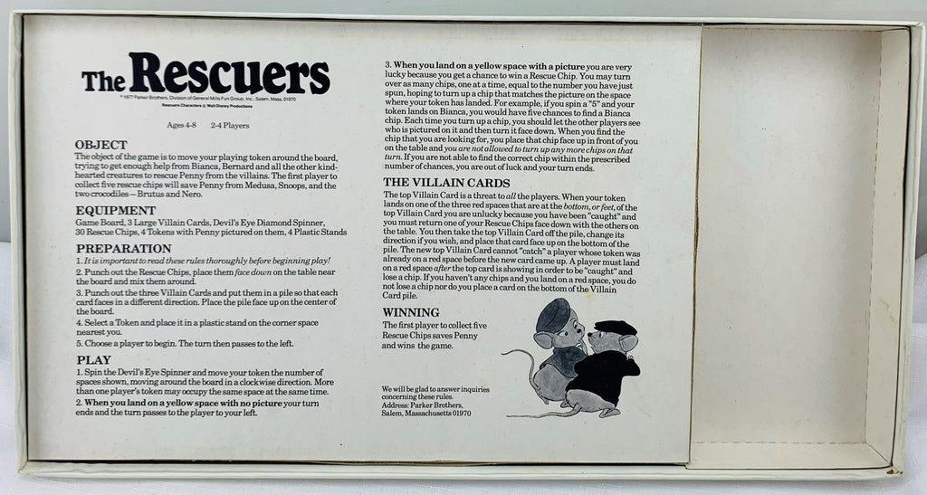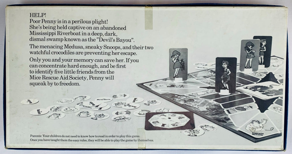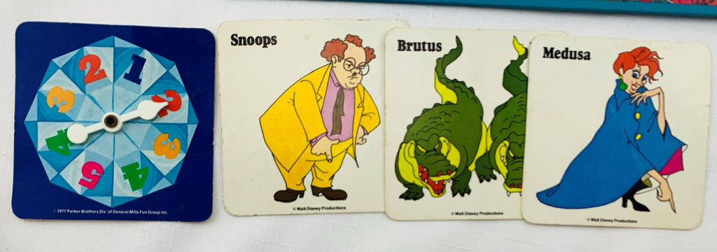 The object of the game is to move your playing token around the board, trying to get enough help from Bianca, Bernard, and all the other kindhearted creatures to rescue Penny from the villains. The first player to collect five rescue chips will save Penny from Medusa, Snoops, and the two crocodiles - Brutus and Nero.