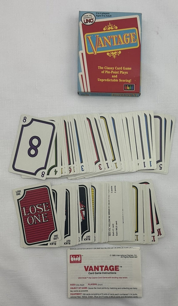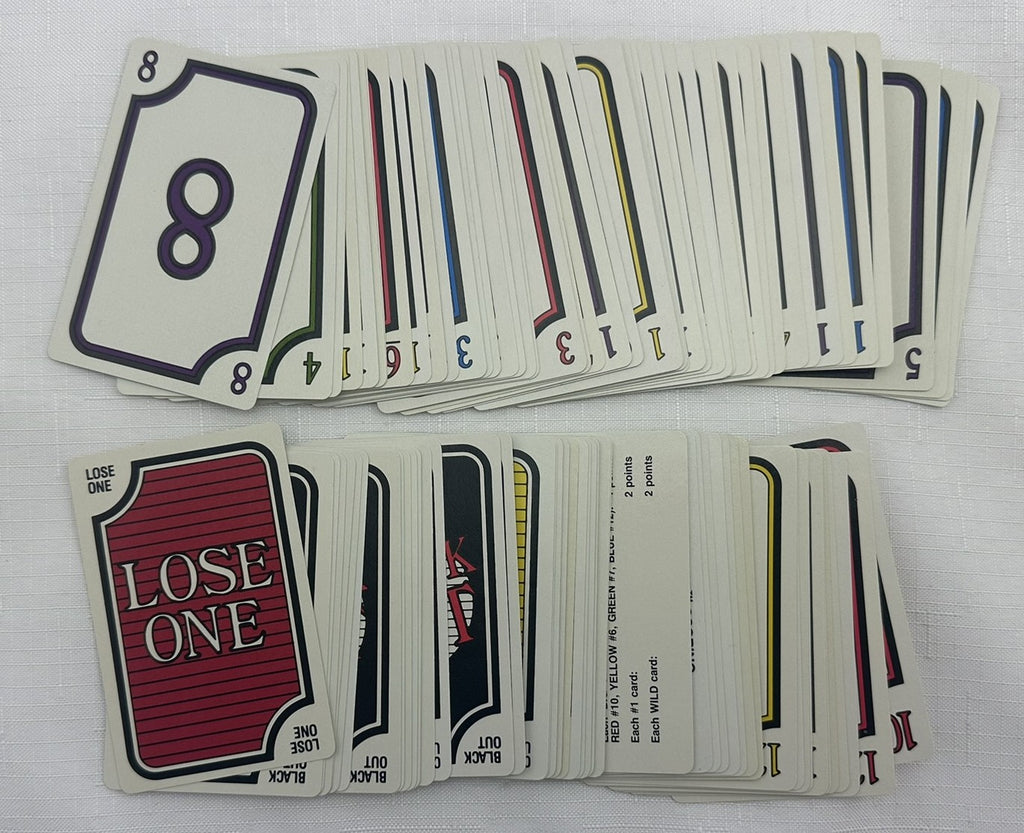 After you've played your 4 cards in this way, another round ensues, and so forth until the entire deck has been gone through. Scoring is +10 for the most cards collected, +8 for the most Purple cards collected, +6 for the most Red cards collected, +4 for each "BIG" card collected, +2 for each 1 card, +2 for each Wild card.
